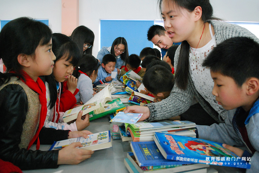 志愿者帶著小讀者相互推介和借閱書籍。(石玉成/攝)