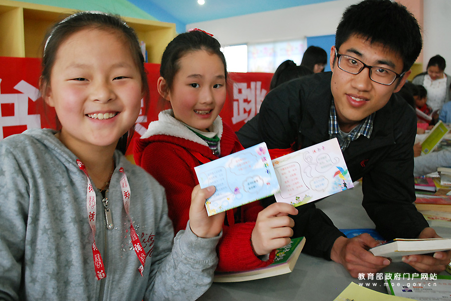 小讀者在展示志愿者送給他們的讀書小貼士。(石玉成/攝)