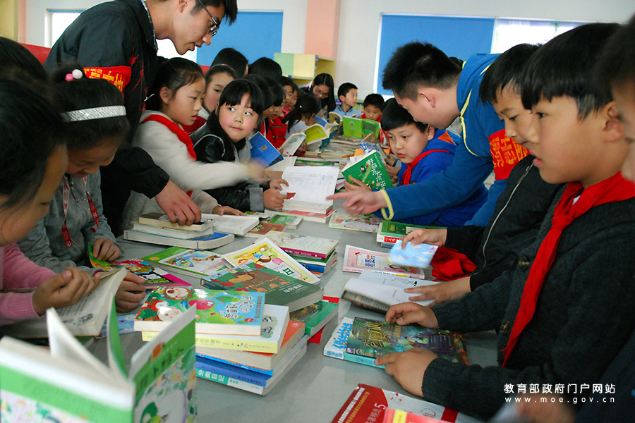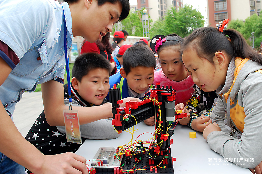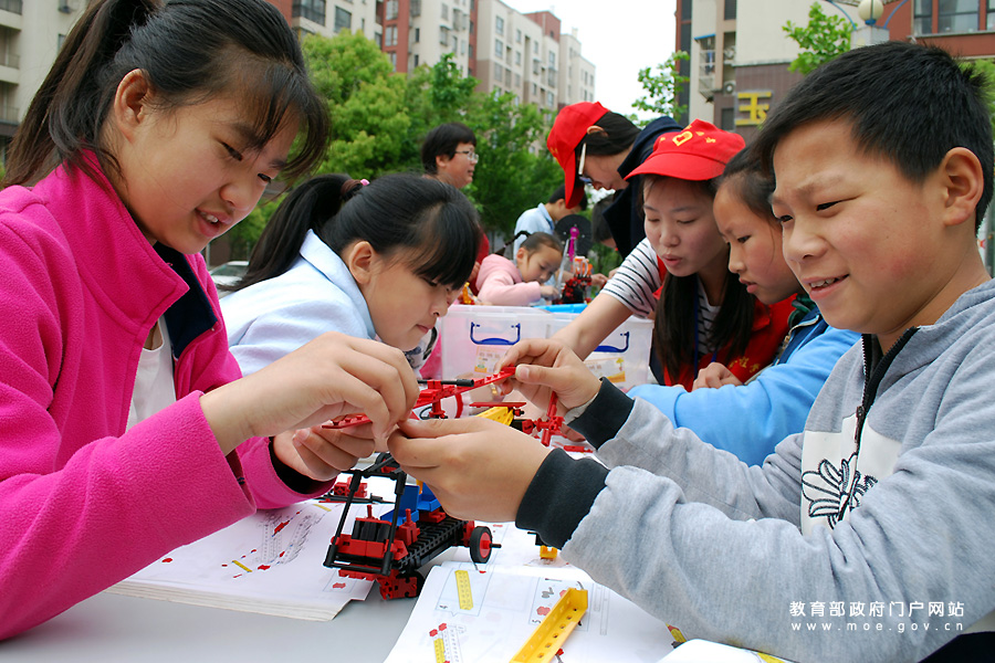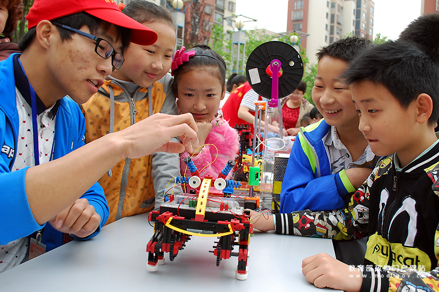 1/0志愿者在指導(dǎo)小學(xué)生拼裝慧魚(yú)機(jī)器人模型。(石玉成 支良澤/攝)