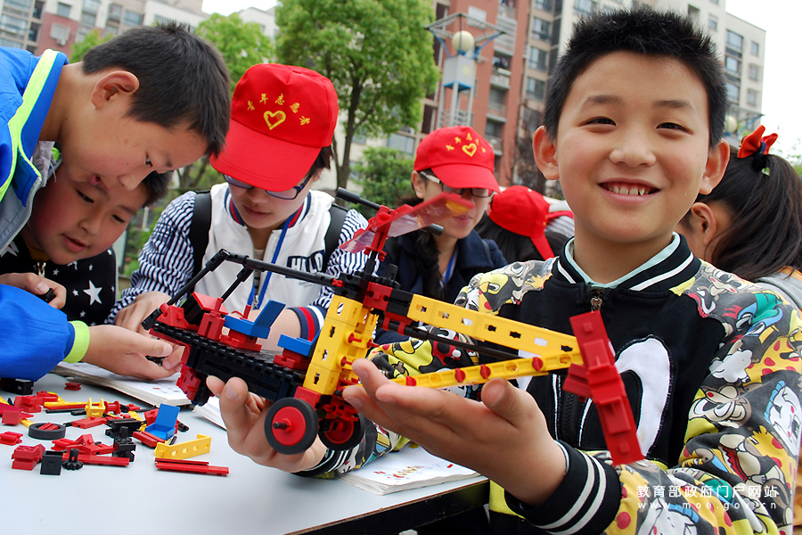 1/0一名小學(xué)生在展示他拼裝的“直升機(jī)”模型。(石玉成 支良澤/攝)