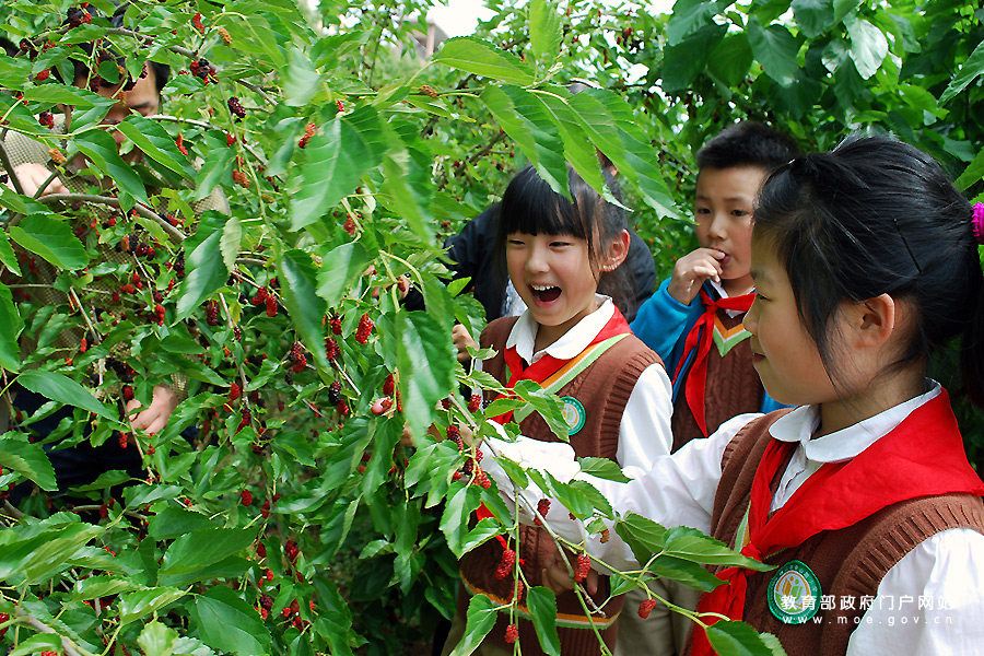 江蘇科技大學(xué)志愿者與小學(xué)生一起采摘、品嘗桑葚。(石玉成 任曉妹/攝)