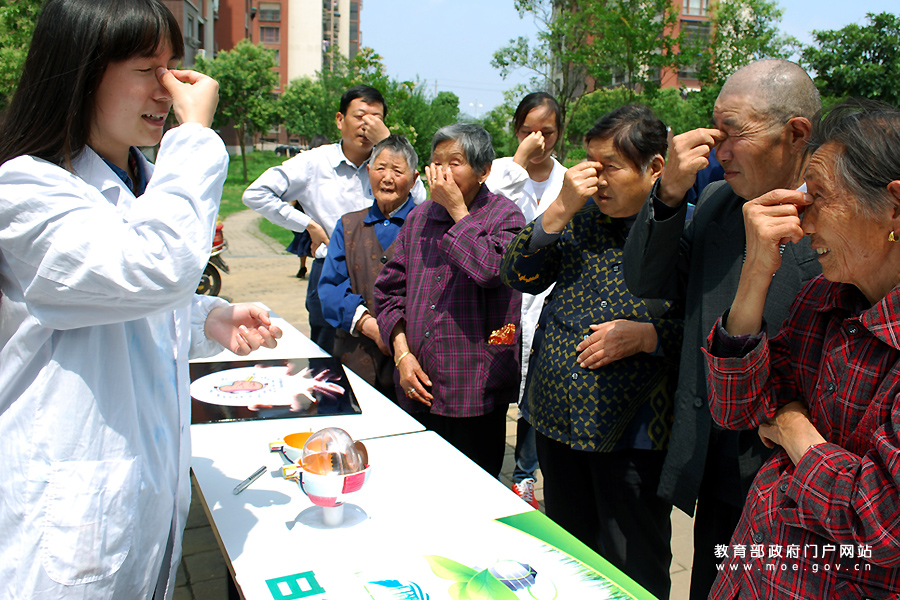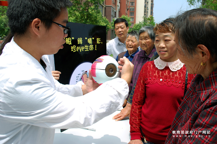 志愿者通過眼球結(jié)構(gòu)模型向居民宣講科學(xué)護眼知識。(石玉成 陶文杰/攝)
