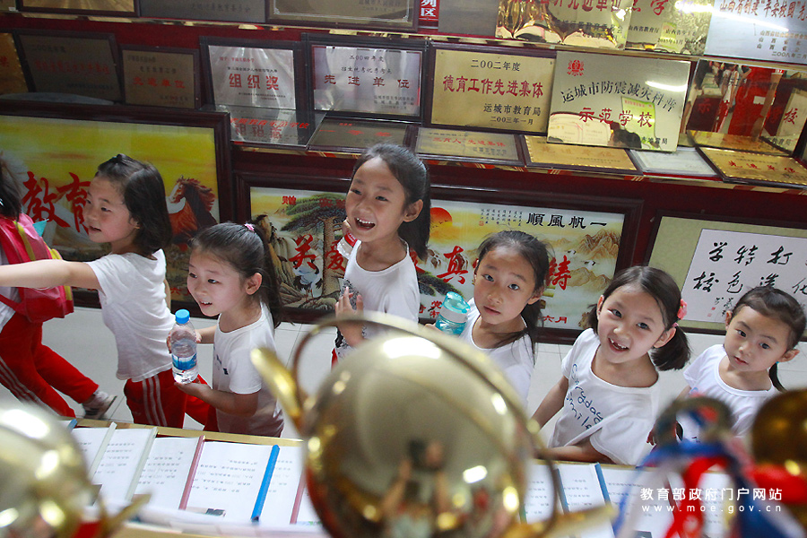 孩子們看到平陸縣實(shí)驗(yàn)小學(xué)展覽室琳瑯滿目的獎(jiǎng)杯,露出呀的神情。(張學(xué)軍/攝)