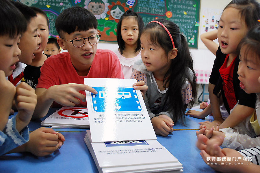 志愿者通過交通標(biāo)識為小學(xué)生講解交通安全知識。(石玉成 孫澤宇/攝)