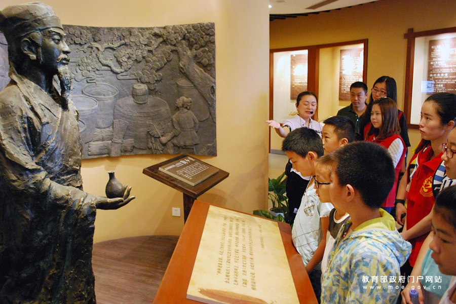 志愿者帶著小朋友在醋文化博物館參觀體驗醋文化。(石玉成 丁永萍/攝)