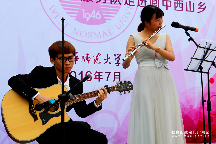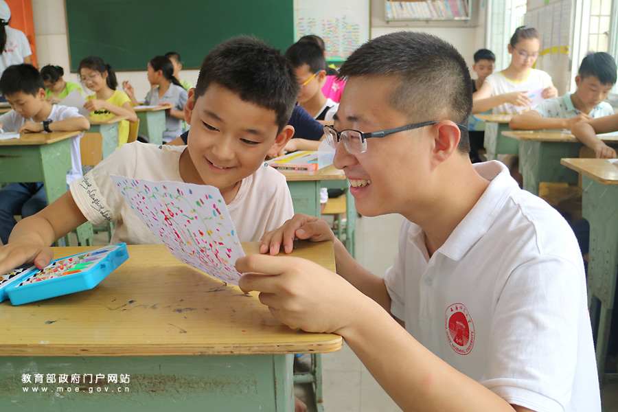 1/0國(guó)獎(jiǎng)學(xué)子教留守孩子學(xué)習(xí)粉筆字。近日,由西華師范大學(xué)20名國(guó)家獎(jiǎng)學(xué)金獲得者組成的支教團(tuán),赴該校精準(zhǔn)扶貧工作重點(diǎn)幫扶單位四川省閬中市西山鄉(xiāng),組織開展了豐富多彩的趣味教學(xué)和科普活動(dòng),讓當(dāng)?shù)亓羰貎和冗^了一個(gè)愉快的假期。