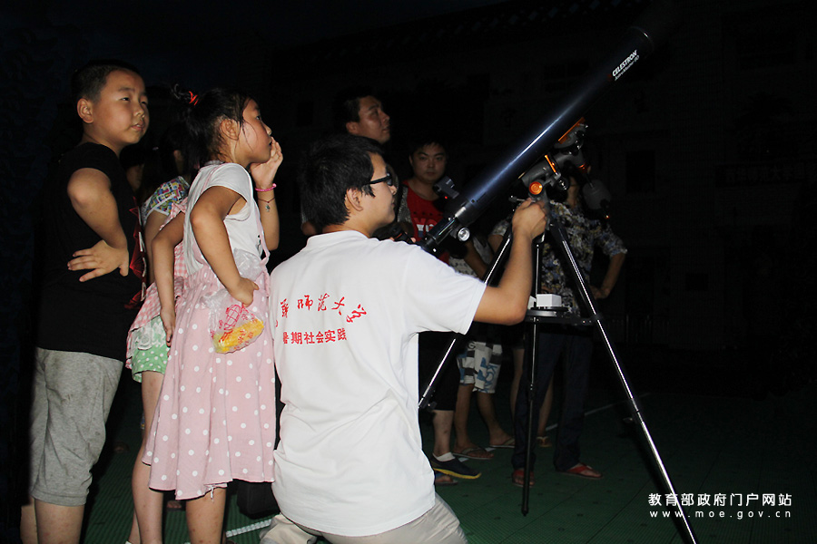 1/0夜幕下,孩子們圍在天文望遠(yuǎn)鏡旁,爭(zhēng)先恐后地觀察月亮。