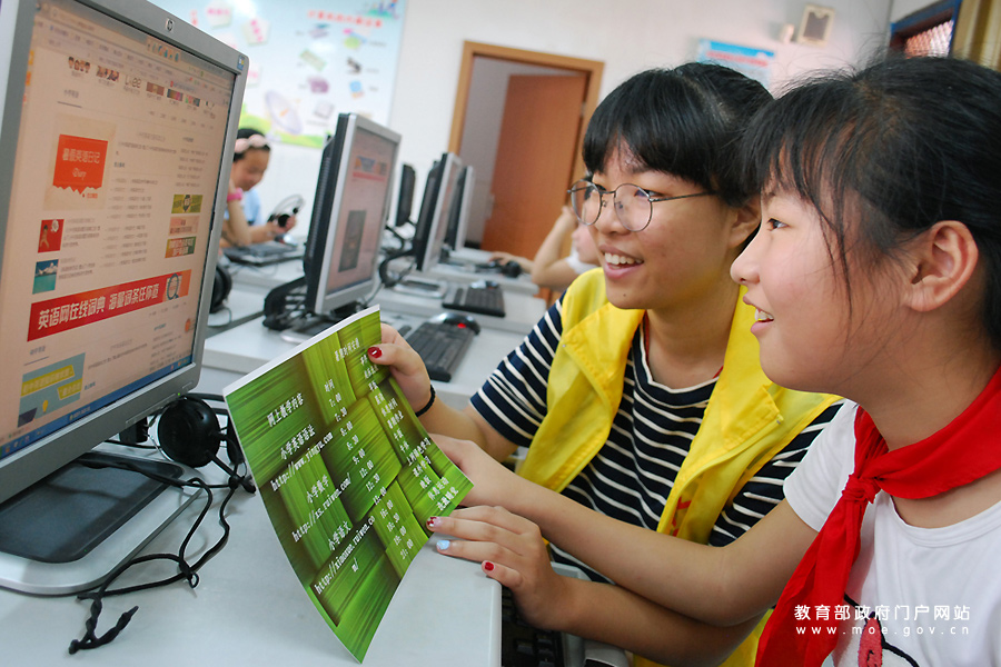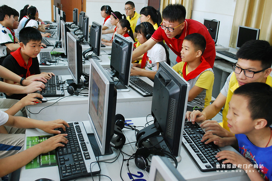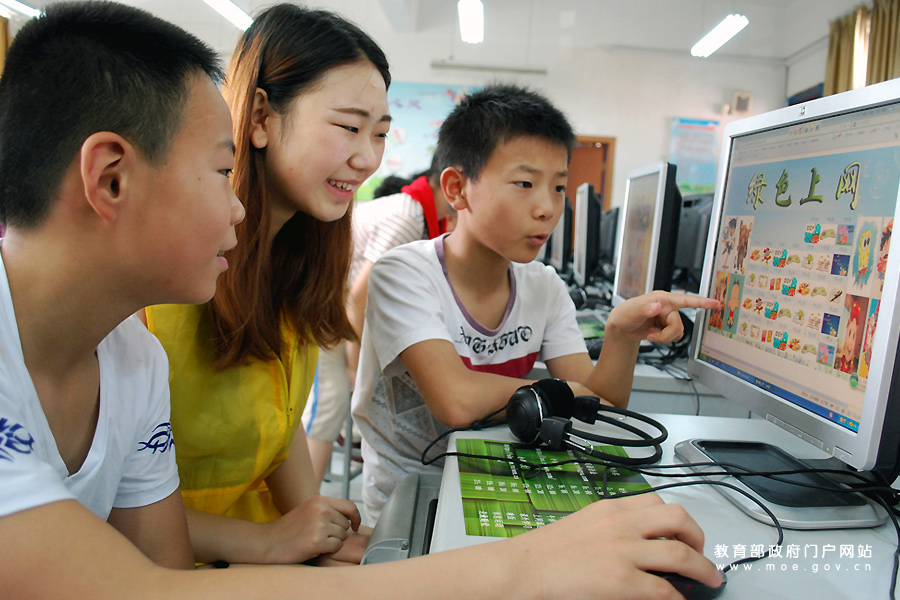 1/0志愿者在指導(dǎo)外來(lái)務(wù)工人員子女上網(wǎng)學(xué)習(xí)詩(shī)詞。近日,江蘇省鎮(zhèn)江市朱方路小學(xué)開(kāi)展“小候鳥(niǎo)綠色上網(wǎng)度暑假”活動(dòng),來(lái)自江蘇大學(xué)的志愿者為外來(lái)務(wù)工人員子女設(shè)計(jì)暑期上網(wǎng)課程,向孩子們傳授綠色上網(wǎng)知識(shí)和網(wǎng)上讀書(shū)學(xué)習(xí)等技能,指導(dǎo)“小候鳥(niǎo)”們快樂(lè)度假。(石玉成 錢(qián)靜漪/攝)