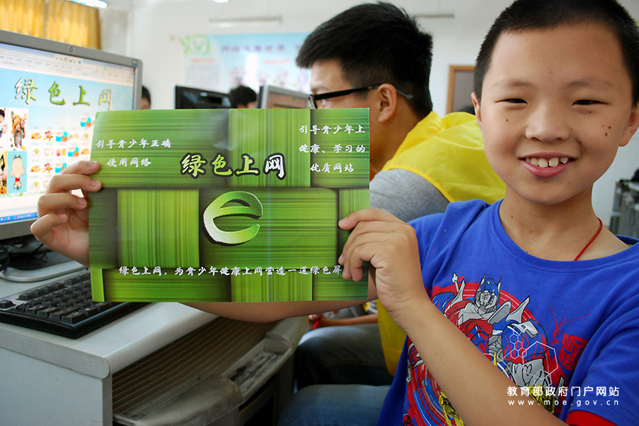 1/0一名外來(lái)務(wù)工人員子女在展示綠色上網(wǎng)指導(dǎo)卡。(石玉成 錢(qián)靜漪/攝)