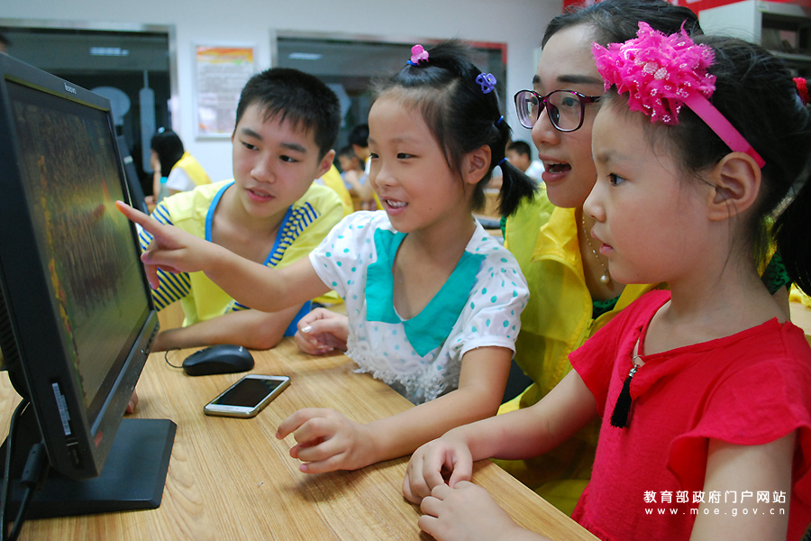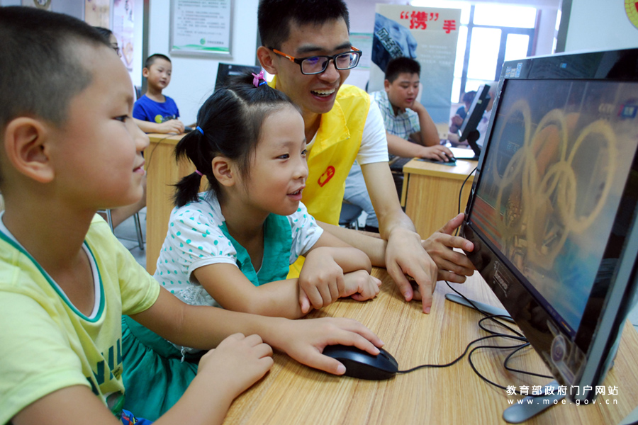 江蘇大學志愿者在指導小朋友上網(wǎng)觀看里約奧運會開幕式盛況。(石玉成 錢靜漪/攝)