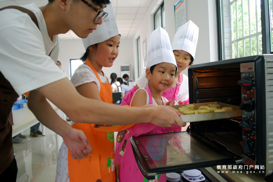 1/0志愿者指導(dǎo)小朋友將制作的月餅放入烤箱。(石玉成 肖怡晨/攝)