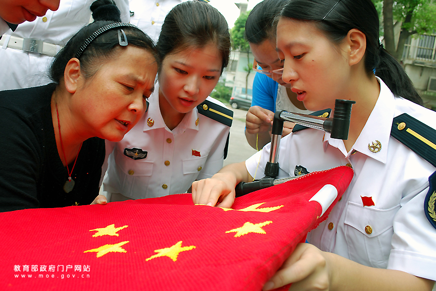 江蘇科技大學(xué)的學(xué)生和社區(qū)老黨員一起繡國旗。(石玉成 鹿婷/攝)