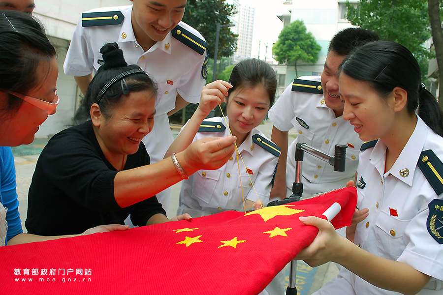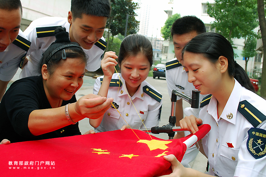 近日,江蘇科技大學(xué)國防學(xué)院部分學(xué)生黨員走進(jìn)鎮(zhèn)江市潤州區(qū)和平路街道牌灣社區(qū),開展“繡面國旗頌祖國”活動,大學(xué)生黨員與社區(qū)老黨員共同繡五星紅旗,暢談幸福生活,向祖國母親67周年華誕獻(xiàn)禮。(石玉成 鹿婷/攝)