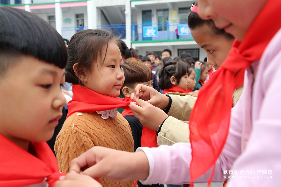 1/0河南省溫縣第一實(shí)驗(yàn)小學(xué)一名高年級(jí)少先隊(duì)員為新入隊(duì)的學(xué)生佩戴紅領(lǐng)巾。(徐宏星/攝)