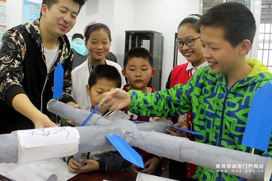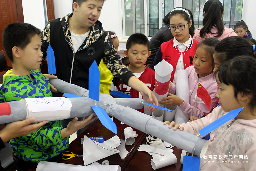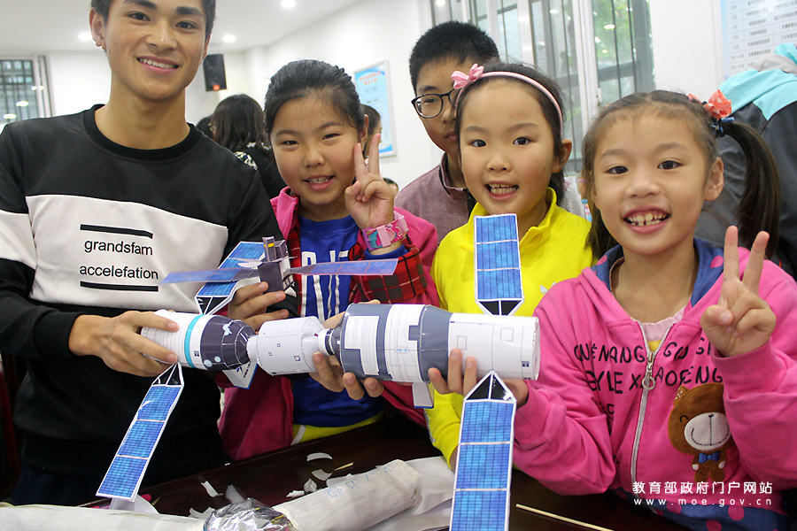 志愿者和小朋友在展示制作的天宮一號模型。(石玉成 肖怡晨/攝)