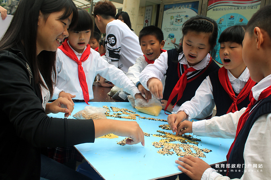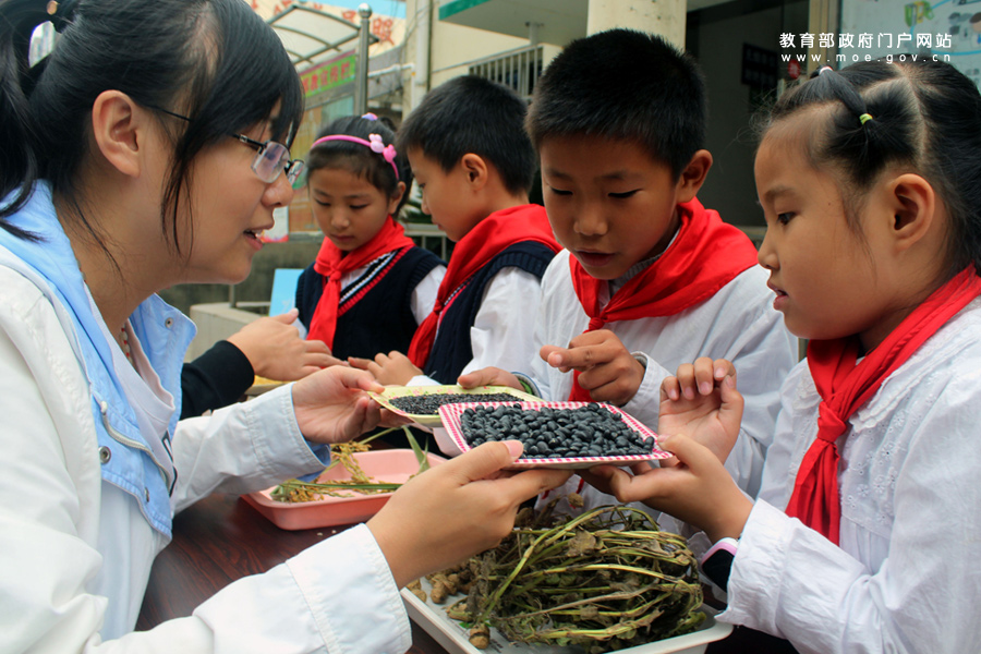 志愿者在為小學生講解五谷雜糧的功用。(石玉成 譚海波/攝)