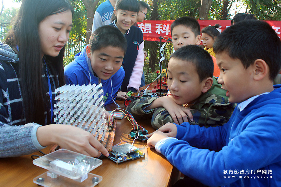 志愿者在為小朋友演示講解“光立方”的功能。(石玉成 周志輝/攝)