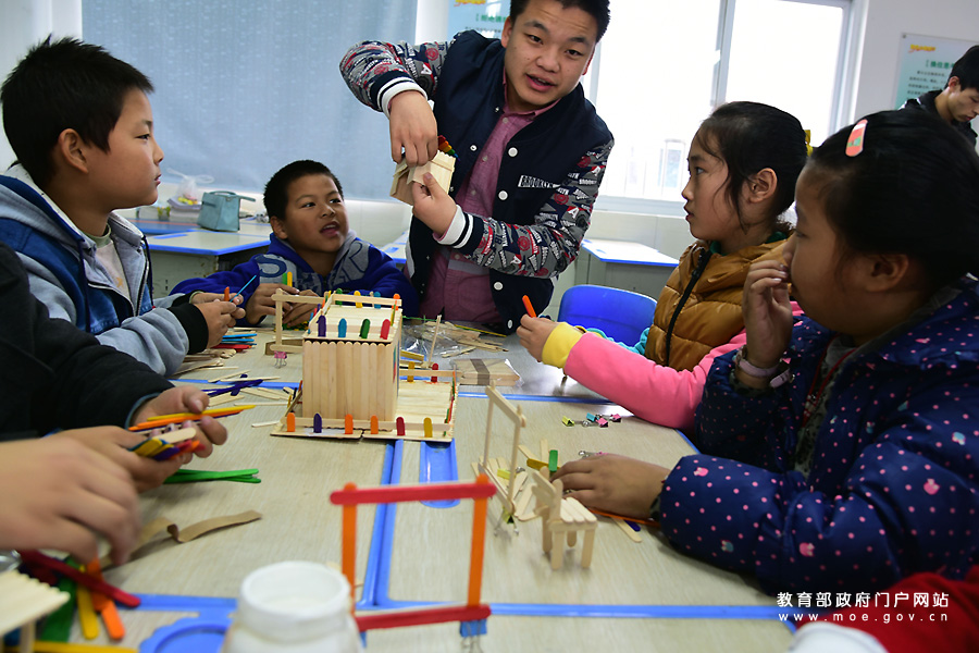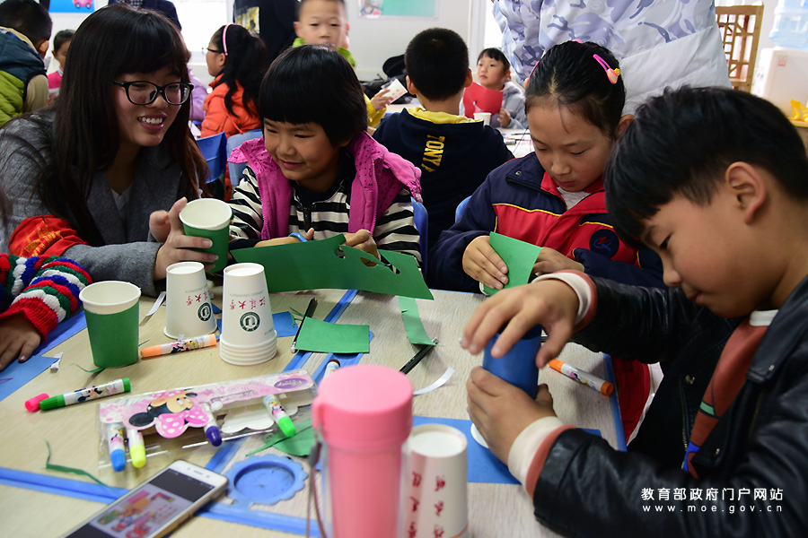 志愿者指導(dǎo)留守兒童“變廢為寶”制作各種工藝品和玩具。(石玉成 高伏康/攝)
