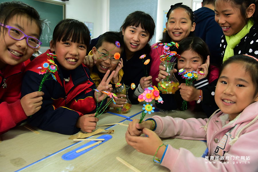 留守兒童在展示“變廢為寶”制作的紐扣花。(石玉成 高伏康/攝)