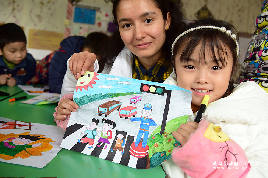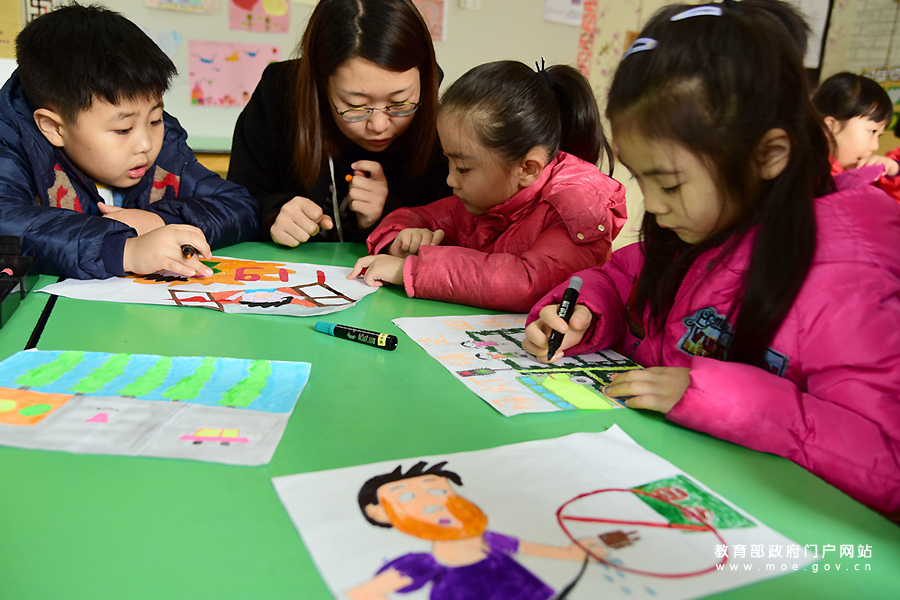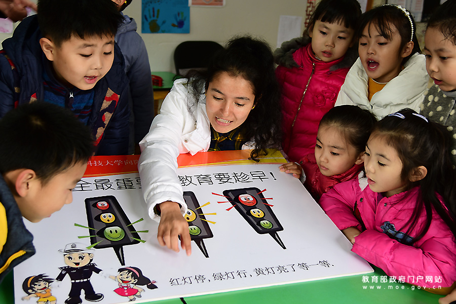 志愿者在指導幼兒學習交通安全兒歌。近日,江蘇科技大學志愿者來到鎮(zhèn)江市解放路大地幼兒園,開展“安全知識從小學起”活動,指導幼兒通過兒歌誦讀、趣味漫畫、涂鴉創(chuàng)作等形式,學習交通、消防等安全知識,引導孩子們從小增強安全意識。(石玉成 孫瑾屏/攝)