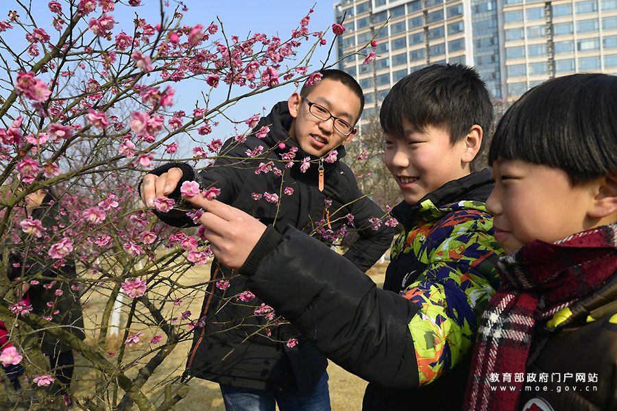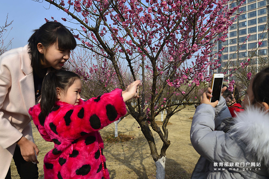 2月25日,江蘇大學(xué)志愿者帶著鎮(zhèn)江市潤州區(qū)金山街道紅光社區(qū)的小朋友走進(jìn)該校的梅花園,開心觀賞盛開的梅花,指導(dǎo)孩子們用手機拍攝梅花,在快樂體驗中感受大自然的美麗。(石玉成 劉浩/攝)