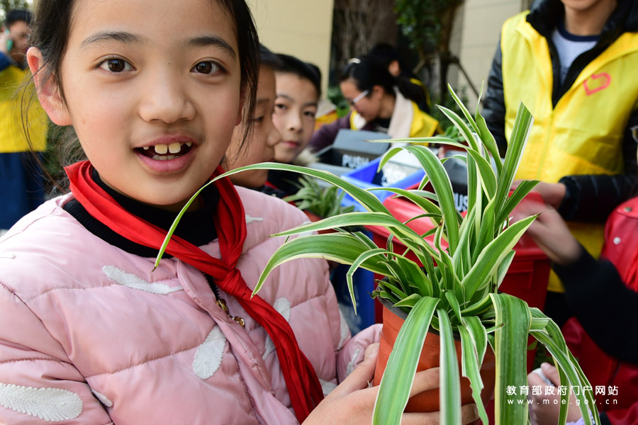 一名小朋友在展示用廢舊電池?fù)Q取的綠植。(石玉成 劉浩/攝)