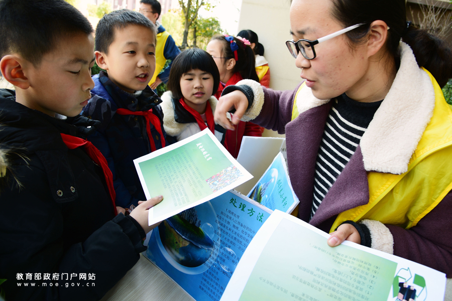 志愿者在為小朋友講解廢舊電池的危害及處理方法。(石玉成 劉浩/攝)