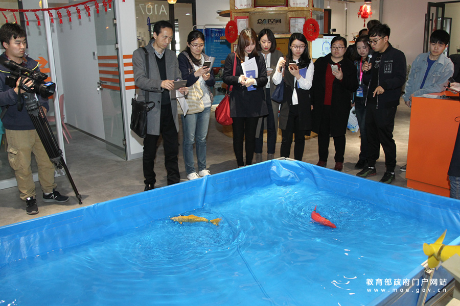 1/0采訪團(tuán)在觀看機(jī)器魚在水中游動(dòng)。(于淼/文 樊世剛/攝)