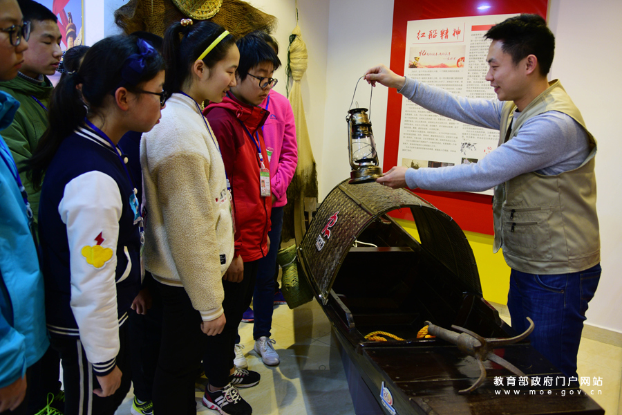 凌滋譽在為學(xué)生們講解參加過抗日戰(zhàn)爭的漁民文必才的革命故事。(石玉成/攝)