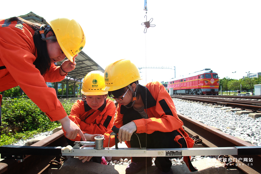 柳州鐵道職業(yè)技術(shù)學(xué)院的學(xué)生在軌道交通綜合實訓(xùn)基地測量軌距。(張學(xué)軍/攝 忠建豐/文)