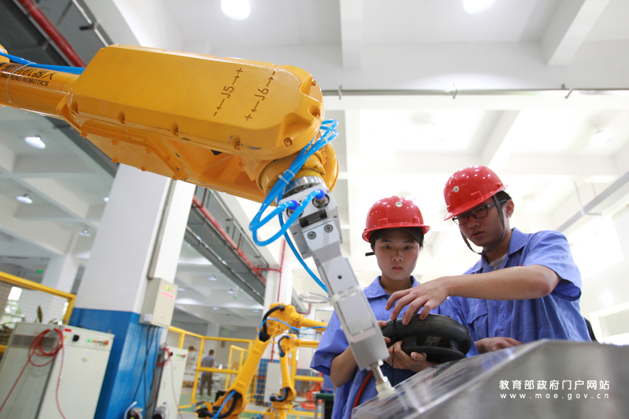 柳州職業(yè)技術(shù)學(xué)院的學(xué)生們正在實訓(xùn)中心操作工業(yè)機器人。(張學(xué)軍/攝 忠建豐/文)