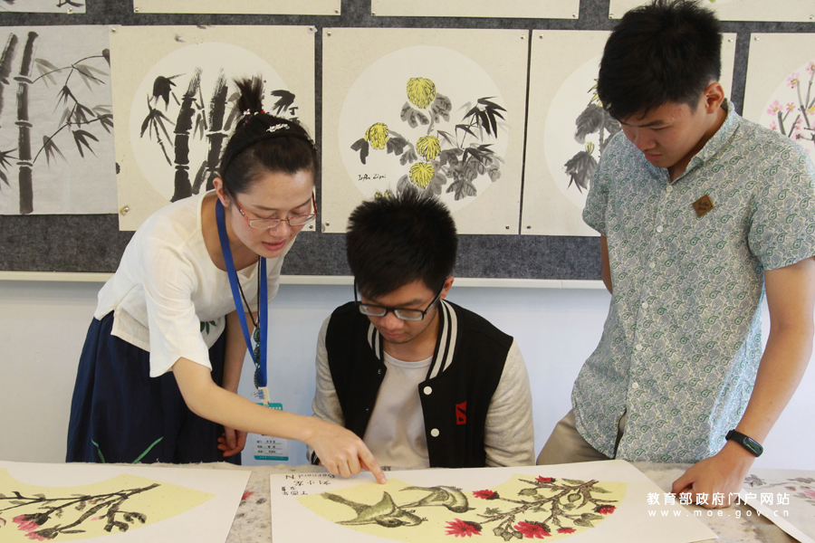 柳州城市職業(yè)學(xué)院的老師在書法體驗室內(nèi)為留學(xué)生講解扇面知識。(張學(xué)軍/攝 忠建豐/文)