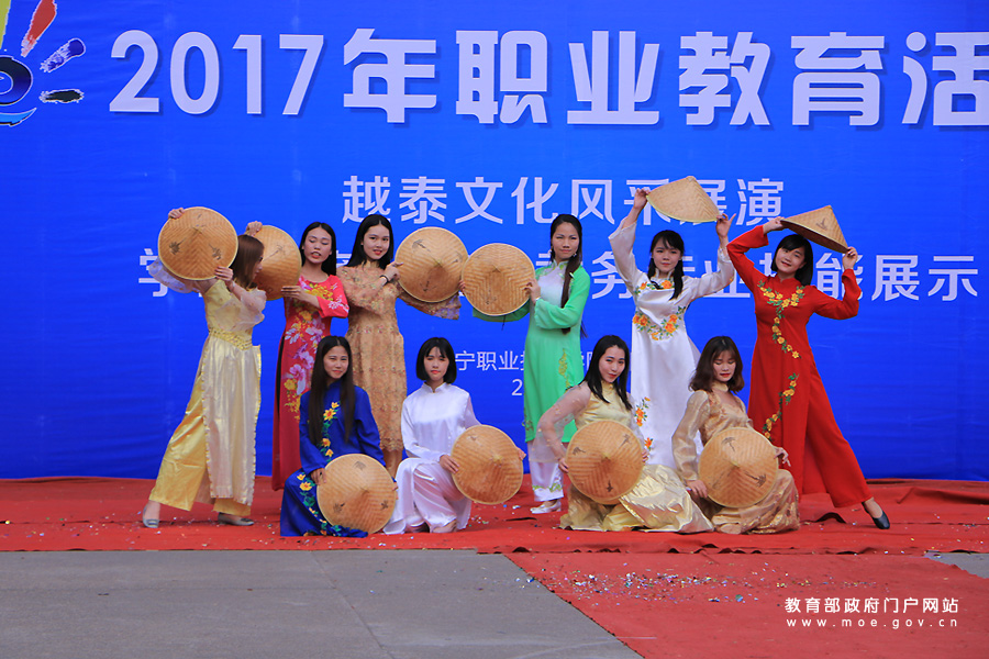 1/0南寧職業(yè)技術(shù)學(xué)院越南語(yǔ)專(zhuān)業(yè)學(xué)生通過(guò)舞蹈展示越南民族服飾。(馮星源/攝)