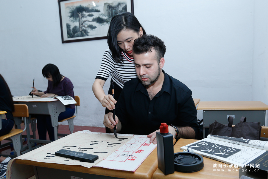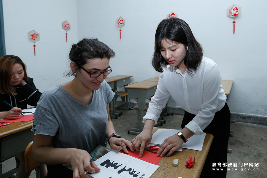 福建師范大學教師指導留學生學習書法。(張勁松/攝 李娜/文)
