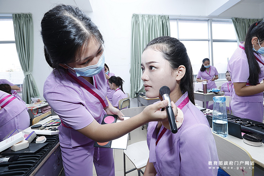 1/0海南省經(jīng)濟(jì)技術(shù)學(xué)校美容美體專業(yè)班學(xué)生符孟云正在給同學(xué)化妝。為迎接黨的十九大,教育部新聞辦組織中央媒體采訪團(tuán)深入地方,用圖文記錄十八大以來(lái)教育改革發(fā)展的新進(jìn)展。6月28日,采訪團(tuán)一行走進(jìn)海南,就“教育精準(zhǔn)扶貧”情況走訪了海南省經(jīng)濟(jì)技術(shù)學(xué)校。(張勁松/攝 王穎/文)