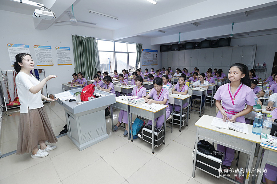 1/0在海南省經(jīng)濟(jì)技術(shù)學(xué)校美容美體專業(yè)班內(nèi),趙倩倩老師在給扶貧巾幗勵(lì)志班學(xué)生教授普通話口語(yǔ)交際課。(張勁松/攝 王穎/文)
