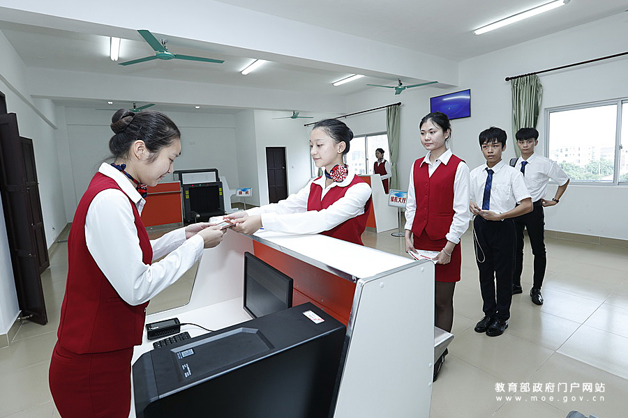 1/0海南省經(jīng)濟(jì)技術(shù)學(xué)校航空服務(wù)專業(yè)班的同學(xué)們?cè)谀M機(jī)場(chǎng)出發(fā)廳地面服務(wù)和安檢的實(shí)際操作。(張勁松/攝 王穎/文)