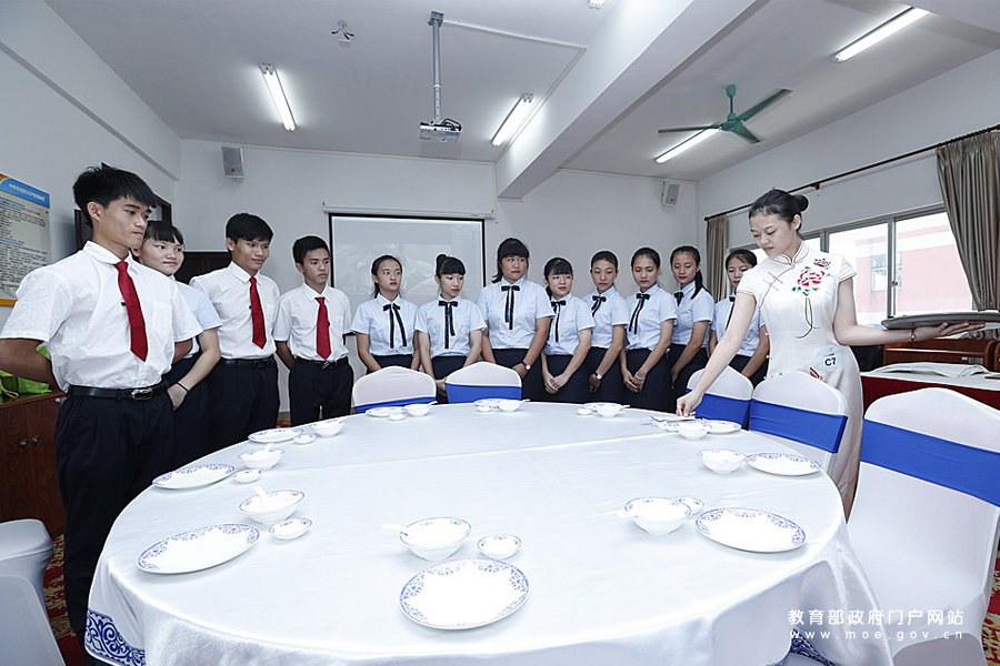 1/0在海南省經(jīng)濟(jì)技術(shù)學(xué)校高星級(jí)飯店運(yùn)營(yíng)與管理專業(yè)班內(nèi),學(xué)生方婷在為同學(xué)們展示中餐宴會(huì)擺臺(tái)。(張勁松/攝 王穎/文)