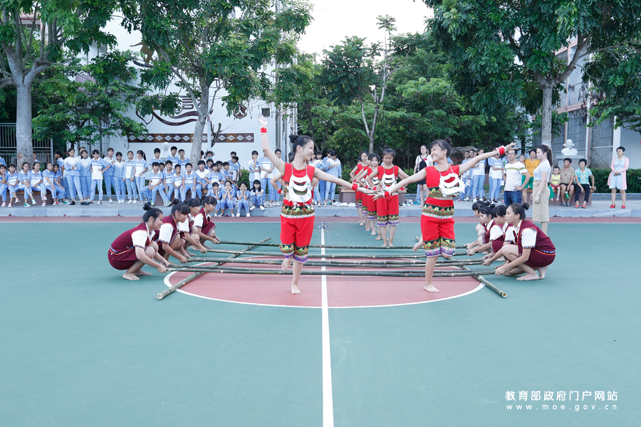 1/0海南陵水思源實(shí)驗(yàn)學(xué)校操場(chǎng)上,學(xué)生們身著民族服飾排練黎族特色舞蹈——竹竿舞。(張勁松/攝 王穎/文)