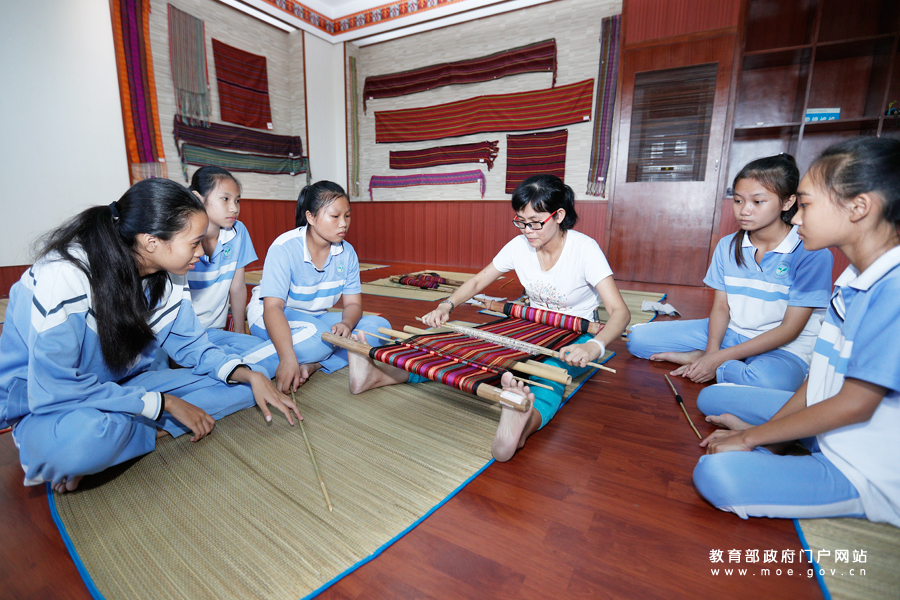 1/0海南陵水思源實(shí)驗(yàn)學(xué)校黎錦傳習(xí)館內(nèi),全少菊老師正在指導(dǎo)學(xué)生學(xué)習(xí)黎錦編織。(張勁松/攝 王穎/文)