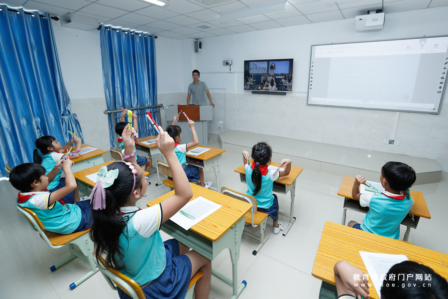1/0海南省三沙市永興學(xué)校內(nèi),8名教師和32名學(xué)生正在舉行升國旗儀式。小旗手張瑞楠(中)已經(jīng)上五年級(jí)了,她是目前永興學(xué)校里年齡最大同時(shí)也是唯一一個(gè)五年級(jí)的學(xué)生。為迎接黨的十九大,教育部新聞辦組織中央媒體采訪團(tuán)深入地方,用圖文記錄十八大以來教育改革發(fā)展的新進(jìn)展。6月29日,采訪團(tuán)一行走進(jìn)我國最南端的學(xué)?!D鲜∪呈杏琅d學(xué)校。(張勁松/攝 王穎/文)