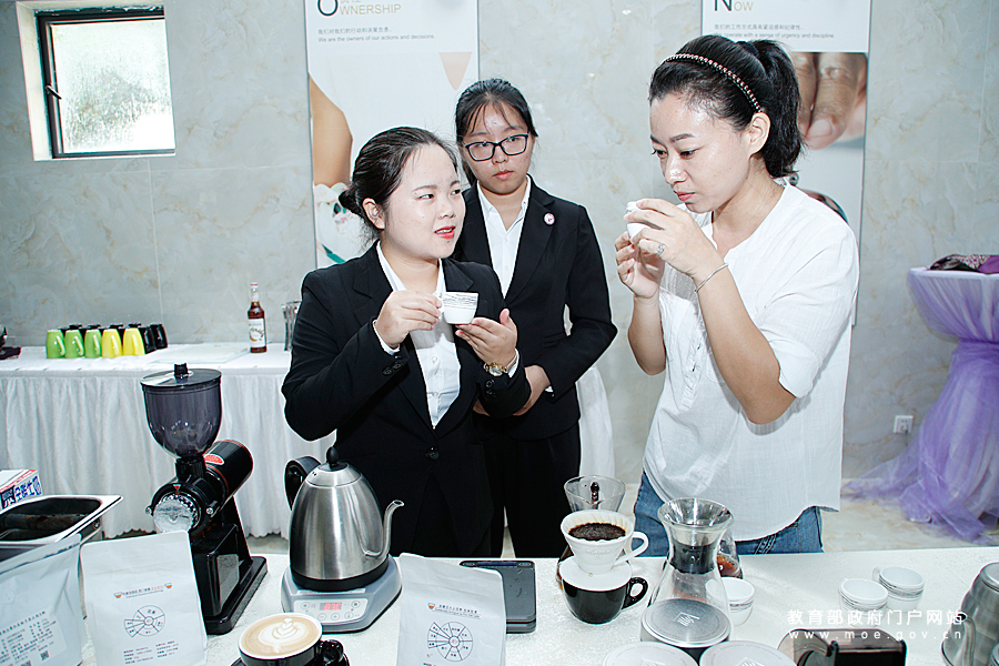 海南三亞學(xué)院白鷺苑實訓(xùn)大廳內(nèi),國際酒店管理學(xué)院酒店管理專業(yè)王麗丹老師在指導(dǎo)學(xué)生品鑒咖啡。(張勁松/攝 王穎/文)