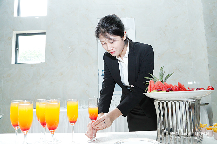 海南三亞學(xué)院白鷺苑實訓(xùn)大廳內(nèi),國際酒店管理學(xué)院酒店管理專業(yè)學(xué)生楊美瑤正在練習(xí)餐廳酒水服務(wù)。(張勁松/攝 王穎/文)