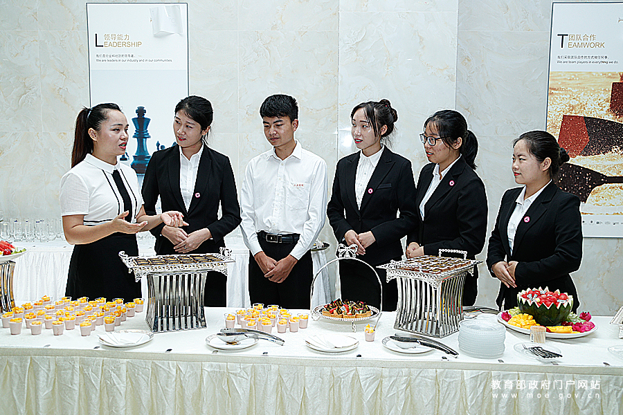 海南三亞學(xué)院白鷺苑實訓(xùn)大廳內(nèi),國際酒店管理學(xué)院酒店管理專業(yè)王春瑜老師正在給學(xué)生們講解西餐服務(wù)的技巧。(張勁松/攝 王穎/文)