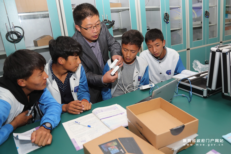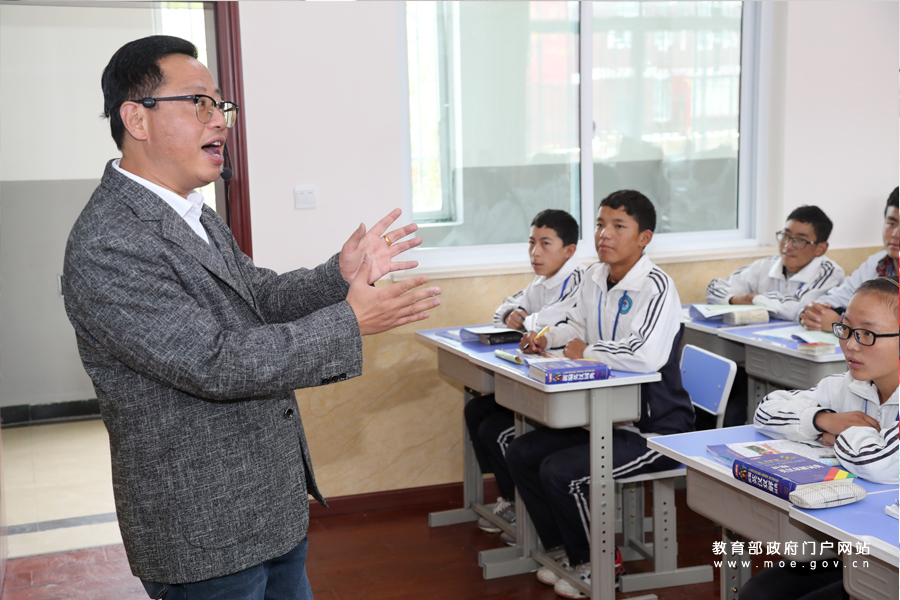 日喀則市上海實驗學(xué)校的浦東教室是由浦東新區(qū)第一批“組團式”教育援藏工作小組捐贈。來自上海的援藏教師徐美河正在給藏族學(xué)生上英語課。(樊世剛/攝 忠建豐/文)