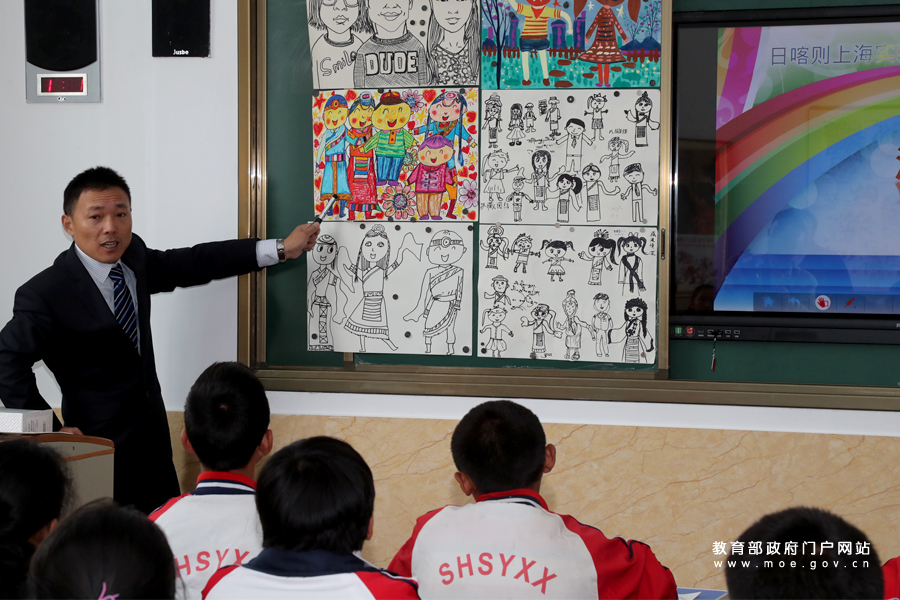 在日喀則市上海實驗學(xué)校教室內(nèi),上海援藏教師高群斌正在給藏族學(xué)生上美術(shù)課。近日,教育部新聞辦組織中央媒體采訪團奔赴西藏,就“組團式”教育人才援藏工作進行深入采訪。8月23日,采訪團一行走進由上海市“組團式”教育援助的日喀則市上海實驗學(xué)校。(樊世剛/攝 忠建豐/文)