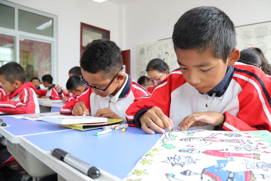 藏族學(xué)生正在認真繪畫。(樊世剛/攝 忠建豐/文)