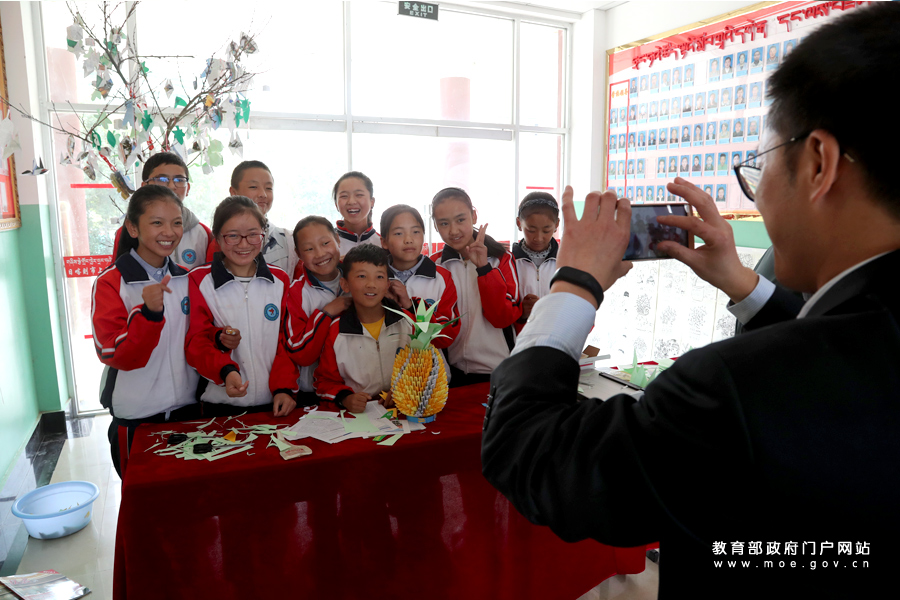 師生集體完成的手工折紙作品,讓藏族學(xué)生們興奮不已,鄭東剛老師為同學(xué)們留影。(樊世剛/攝 忠建豐/文)