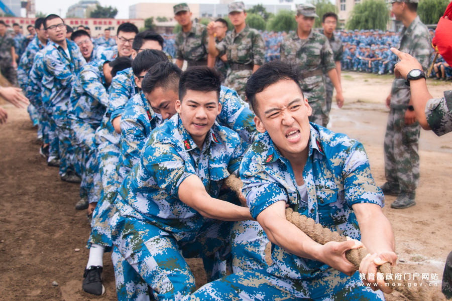 1/0“紅旗招展,喊聲震天”——北京大學軍訓團拔河比賽。(程佳路/攝)