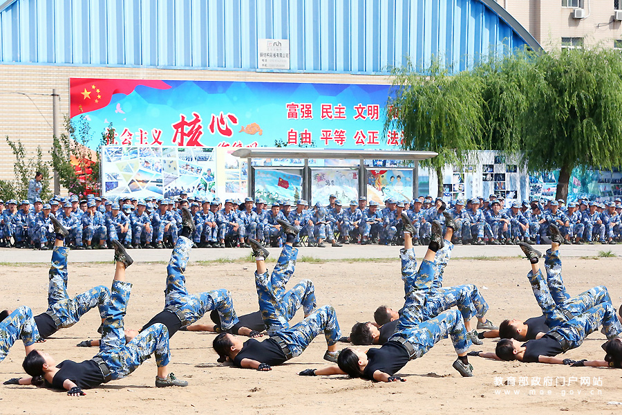 1/0“戰(zhàn)之必勝,斗志滿懷”——北京大學軍訓團軍體拳表演。(程佳路/攝)